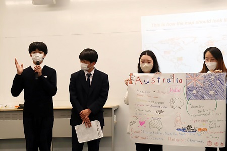 3日目は「Fill in the MAP!(地図で探そう)」という、指示された国を世界地図から探し出すゲームのあとは、いよいよプログラムの集大成となるプレゼンテーションを行いました。グループにわかれて前日に決めた国についてのポスターを作り、国の人口や言語、名産などの特徴を英語で発表しました。