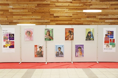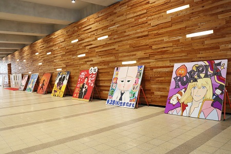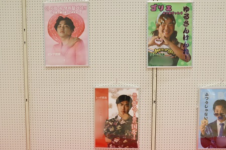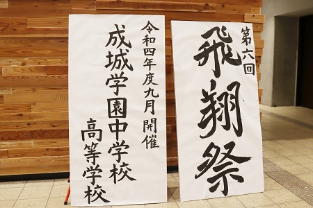 飛翔祭は中高をクラスごとの縦割りにした7つのグループに分かれ、グループ対抗で競技やパフォーマンスの評価を競い順位を争います。校舎1階のコリドーには、各グループから選出された団長のポスターとパネルが展示されています。生徒たちが自ら決めたコンセプトでポスターやパネル、横断幕、のぼり旗、衣装、そしてパフォーマンスを披露するのが飛翔祭では恒例の見どころになっています。