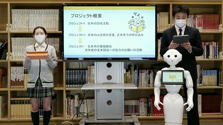 メディア委員会メンバーはPepperを使った「本や雑誌のRe活用」というテーマで課題解決に取り組みました。学校で毎年約300冊も本・雑誌が廃棄されているという課題に目を向け、プロジェクトA(古本の回収)、プロジェクトB(古本市の開催)、プロジェクトC(実施報告と次年度協力のお願い)という3つのプロジェクトを10か月以上かけて実践しました。古本回収への興味を喚起させるクイズの出題(プロジェクトA)や古本市当日の呼び込み(プロジェクトB)などプロジェクトごとにPepperのプログラミングを行いました。有識者からのフィードバックでは、古本市を開催し売り上げを寄付するという実際の行動につながっている点が評価されました。
