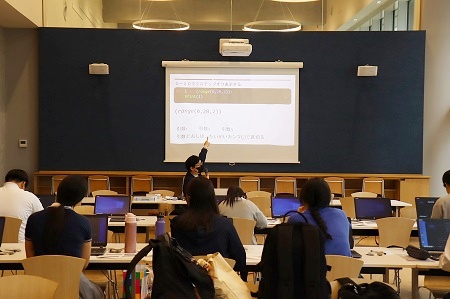吉田さんは幼稚園から大学まで成城学園で過ごした卒業生。子供時代、中高生時代、大学生時代をどのように過ごし、どのようにしてエンジニアの道へ進んだのかをお話しいただきました。続いてさっそくプログラミングについての講義へ。PCのプログラミング言語は200種類以上もあるとのこと。その中でも現在は、シンプルなコードで記述でき、汎用性の高いPythonが世界で需要の高い言語として使用されているとの説明があり、さっそくプログラミングを使った実習に移りました。今回は今日からプログラミングを始めたい人でも分かりやすいようにプログラミングの基礎からスタートする初心者向けの実習を行っていただき、一人一台のPCを使ってコードを入力してプログラミングの作成をしました。最初は指定されたコードを入力してプログラムを実行し、結果を確認しました。続いてユーザーからの入力を受けてその結果を表示するプログラムを作成し、最後に年齢計算をするアプリを各自で作成してみました。2時間限定という制約の中、アプリとしてアップする前までの作業、アップする為に必要なエラー対策方法の伝授と、基礎知識として十分な講義・作業を行えました。