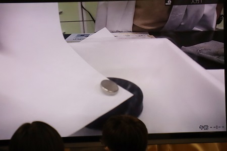 超伝導体の上に浮いている磁石を見て驚きの声が上がりました