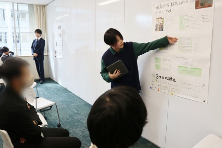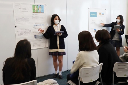 昨年の12月25日から27日まで、中高生15名が筑波大学附属駒場中・高等学校、灘中学校・灘高等学校と合同の福島フィールドスタディに参加しました。地震、津波、原発事故という複合災害を経験した福島を訪れ、現地の方の話を聞き、これからの未来にどう活かすか探究・創造することを目的として企画されたもので、3月11日(月)にフィールドスタディの総括として報告会が行われました。参加した生徒たちは、フィールドスタディを通して各自が興味を持ったテーマをさらに調べ、問いを立て、解決策を提示する探究学習を行ってきました。報告会では、各自の学習内容が1枚のポスターにまとめられ、それを元に5分間で内容を発表するというポスターセッション形式で行われました。成城学園中学校高等学校、筑波大学附属駒場中・高等学校の生徒に加え、各校教職員、保護者、さらに福島からホープツーリズムの方が足をお運びくださり、総勢50名以上の方にご参加いただき、各ポスターセッションを巡りながら報告を聞いていただきました。