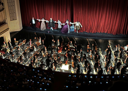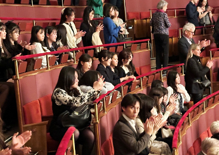 ウィーン国立歌劇場で鑑賞する演目は、リヒャルト・シュトラウス作曲 歌劇『薔薇の騎士』です。上演時間は約3時間半の大作です。生徒たちはドレスやスーツなど正装に着替えホテルからバスにて歌劇場に向かいました。人気の演目の一つですので、チケットは完売です。劇場の前には大勢の観客が集まっていました。私たちの座席は最上階の中央寄りです。舞台は見えにくいものの、このホールでの音響は抜群だと思います。