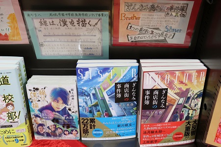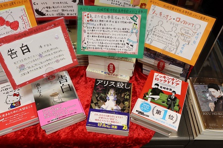 早速、司書教諭・嵜口と企画広報課スタッフとで店舗撮影に伺ったところ、残り少なくなっている本がいくつかありました。撮影後、店長の廣瀬さんにお話を伺ったところ「手書きのPOPはお客様の目を引くので、立ち止まって見ていらっしゃる方もいます。また紹介する本の内容の多様さに感心しました。『告白』は一度品切れになり、再度補充しました。また『日本懐かしお菓子大全』は書店員も知らなくて、こんな本があるんだ!と話題になっていました」と高評価を頂き、大変嬉しく思いました。