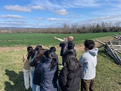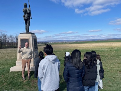 フィールドトリップの行き先は、南北戦争の激戦地として有名なゲティスバーグ。事前学習でも触れはしましたが、百聞は一見にしかずとはこのこと。国立軍事公園を巡って多くの戦場や記念碑を見学し、南北戦争に詳しいウッド先生から様々なエピソードを聞かせていただくことで、当時の様子を非常にリアルにイメージすることができました。旅行ではなかなか足が向かないかもしれませんが、アメリカの歴史上非常に重要な場所を訪ねることができました。こういったところに「授業」として向かえるところも、このプログラムの良さなのだと感じます。