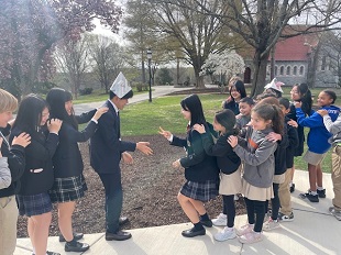 まずはスカベンジャーハント。マクダナ校にまつわる問題用紙を手に、グループに分かれてキャンパス中を駆け回りました。多くの生徒や教職員の助けを得て、何とか完答できたようです。