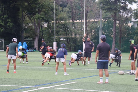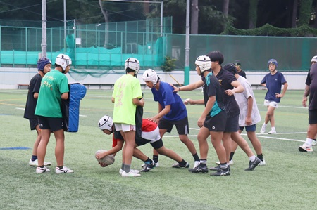 10月3日(金)の放課後、第2グラウンドでニュージーランドのウェリントンカレッジ(WELLINGTON COLLEGE)でラグビーを指導するコーチ、ピリ・ウィプー氏、ネミア・ティアラタ氏の2名と、このコーチの下でラグビースキルを学んでいるウェリントンカレッジ卒業生2名、現役の生徒1名を招き、成城学園中学校ラグビー部と千歳中学校ラグビー部の合同でラグビークリニックが行われました。ウェリントンカレッジは、ニュージーランドの国立男子中等教育学校でこれまで35人ものオールブラックス選手を輩出したラグビーの名門校。今回来校したコーチ2名も元オールブラックスで活躍した選手たちです。このウェリントンカレッジは、ラグビーの指導を含む短期間の留学を日本からも受け入れているとのことで、今回このクリニックのサポートのために成城学園に訪れた学生、生徒も日本からウェリントンカレッジへ留学した経験者だそうです。その留学経験を通して体験したこと、現在の学校生活、将来の展望などを観戦に来たラグビー部保護者たちに伝える場面もありました。