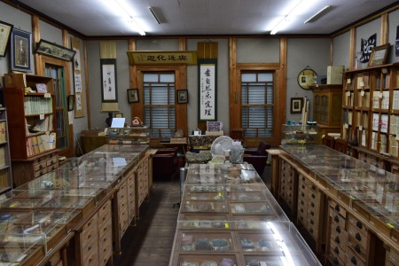 室内にはたくさんの鉱物標本や書籍が整然と保管されています