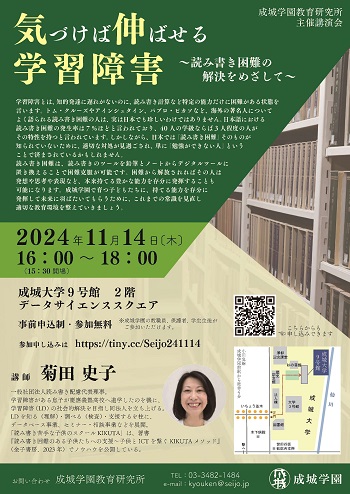 11月14日(木)、教育研究所は菊田史子氏(一般社団法人読み書き配慮 代表理事)を講師に迎え、講演会「気づけば伸ばせる学習障害 ~読み書き困難の解決をめざして~」を開催しました。