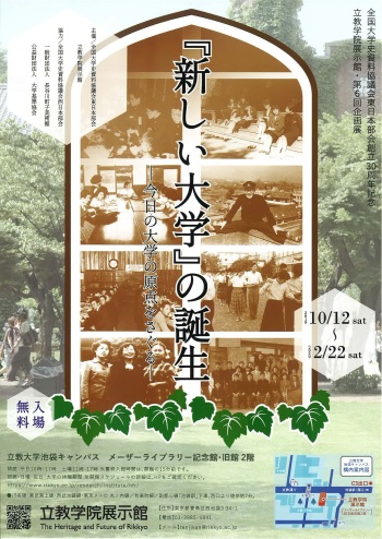 現在、立教学院展示館(豊島区西池袋)において、「『新しい大学』の誕生—今日の大学の原点をさぐる—」(主催:全国大学史資料協議会東日本部会、同展示館)が開催されています。これは、主催の史資料協議会東日本部会の創立30周年記念事業の一環として企画されたもので、戦後まもなく相次いで発足した新制大学の歩みをテーマとしたものです。