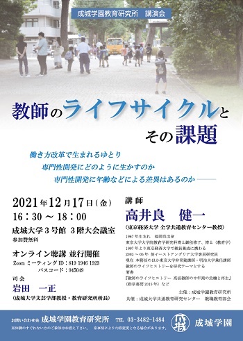 12月17日(金)、教育研究所は成城大学共通教育研究センター教職教育部会との共催で、高井良健一先生(東京経済大学全学共通教育センター教授)を講師にお迎えし、講演会「教師のライフサイクルとその課題」を開催しました。