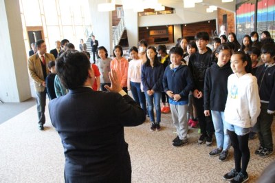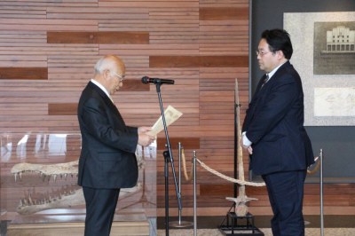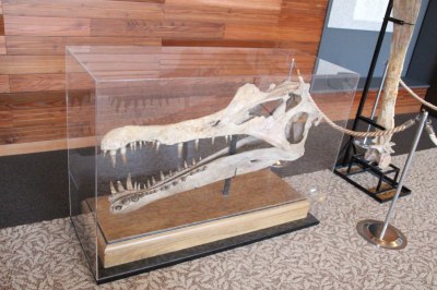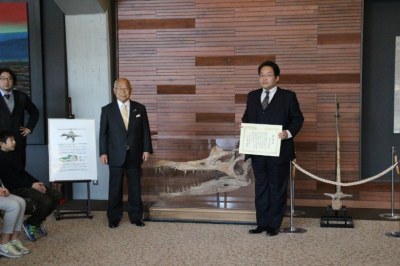 3月12日(月)、澤柳記念講堂のロビーで約1億年前に生きていたとされる恐竜スピノサウルスの頭骨と椎骨の化石標本がお披露目されました。本学園の卒業生であるユマニテク短期大学の十津守宏准教授より寄贈していただいたもので、この日は小学6年生の梅組1クラスが出席し、渡文明理事長による感謝状贈呈式も行われました。第二次世界大戦中に保管されていた標本が消失したことにより「謎の恐竜」とされていたスピノサウルスは、映画「ジュラシックパークⅢ」ではティラノサウルスよりも大きい世界最大の恐竜として紹介されています。今回寄贈していただいた状態のいい頭骨の化石は非常に珍しく、専門家からも注目されている貴重なもの。十津氏は「最もお世話になった成城学園で子どもたちが自然科学に興味を持つきっかけとしてお役に立てれば」とお話してくださいました。