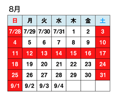 ◆8月1日から 9月4日までの土曜日全日(5日間)