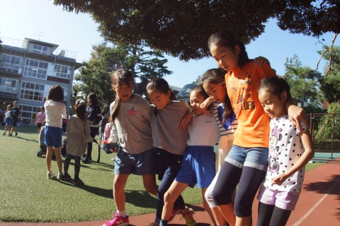 「つながり」の時間では「つながり(縦)の時間-異学年交流の活動」と3年生以上に「つながり(横)の時間-学級内に於いて人間関係を深める活動」を行います。つながり(縦)では、1年生から6年生までが1人ずつのメンバーによるユニットを作り、そのユニットでの活動を通して、異学年の人間関係を築きます。「新入生歓迎会」や「グループハイキング」、「6年制を送る会」などは、ユニット毎に計画し活動します。さらに上級生がリーダーとなり、一緒にあそんだり、ゲームをしたり、勉強することもあれば、運動会前など、場合によってはグループ全員で活動することもあります。また、4〜6年生は「スキー学校」でもユニットの仲間と生活を共にします。つながり(横)では、学級内での人間関係を深めるために「グループワークトレーニング」や「グループエンカウンター」等を参考とした活動を行います。