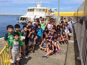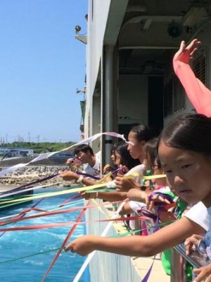 今日はいよいよ与論島を去る日。まずは、5泊6日お世話になった民宿「海水館」をきれいに掃除。そして荷物の整理、最後に食べるお昼ご飯。そして、民宿の滝さんご夫婦へ挨拶をしてフェリーにて那覇へ。与論島では、「さよなら」とは言わず「行って来ます」「行ってらっしゃい」、また訪れる時は「ただいま」 「お帰りなさい」と挨拶します。なんとも心地よい言葉です。5泊6日の島の方々の暖かさが身に染みます。出港の時は仲良くなった島の子どもたちや観光課の皆様他、沢山の方々がテープカットで見送ってくれます。色とりどりのテープが風に舞う様子は、「また来年必ず戻ってこよう」と思う瞬間です。子どもたち一人一人の胸にも熱いものがこみ上げて来ます。5時間かけて那覇へ到着です。長い時間とおもいきや、5泊6日を思い返すにはちょうど良い時間でもあります。6泊7日、家族旅行では体験できない事ができたと思います。