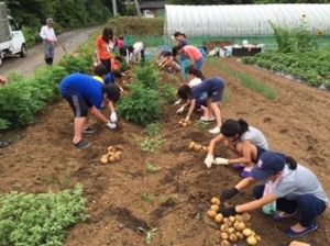 パンの仕込みを行いました。昼のメニューは棒焼きパンだったので各自竹を切り出し、パン生地を巻いて焼きました。 午後には雨が上がったのでジャガイモ掘りを行い、そのお礼として草むしりを行いました。