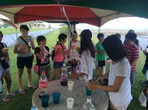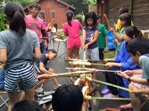 キャンプでなかなか寝つかれず、疲れた体の与論島5日目の午前中はフリータイム。毎日好天に恵まれ、強い日差しの中でも、子どもたちは元気いっぱいに遊泳や貝拾い等、それぞれの活動を計画しています。中でも人気なのは、珊瑚のアクセサリー屋さんの、なつこばあちゃんのお店訪問。綺麗なアクセサリーだけじゃなく、楽しいおしゃべりが最高!なつこばあちゃんは、毎年成城の子どもたちが来るのを楽しみにしてくれて、お菓子など用意してくれています。 午後は島の子どもたち、お世話になった観光課の人たちや学校関係の方たちを、焼きそばと焼き鳥でご招待するお別れパーティが開かれました。初日はモジモジしていたお互いの学校の子達も、すっかり仲良し。アドレスの交換などしている子もいました。 明日はいよいよ与論島ともお別れ。沖縄の那覇へ向かいます。最後の夜、楽しんで‼︎