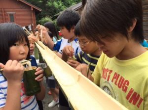 一夜干し体験にも挑戦。一人二杯イカをさばき、はらわたや目や口をとって干しました。昼は流しそうめんを行いました。みんな美味しく食べました。