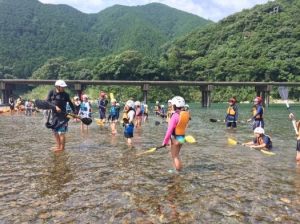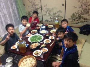四万十川で川遊びと川漁の仕掛けを体験しました。お世話になっているお宅ですごいご馳走の夕食です。カツオのたたき、鮎ご飯、川エビのてんぷらなど地元で採れたものばかりです。