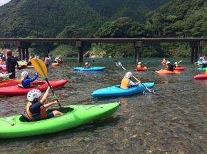 カヌー体験からスタート。まずは出発前に記念写真。 まずはカヌーの漕ぎ方を習います。水がとてもきれい。 色とりどりのカヌーで出発。約3㎞の川下りを満喫しました。晴天に恵まれて楽しく過ごしています。