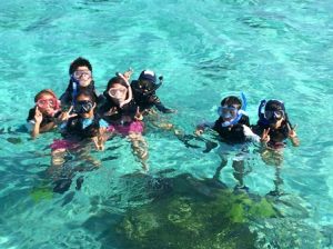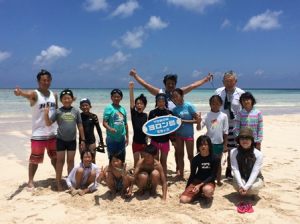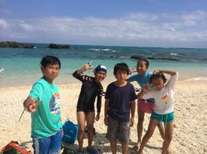 晴天の下、シュノーケリング。透明な水はますますマリンブルーに輝いていました。赤、黄、青と原色の魚たちと枝珊瑚の美しさ。12名の子どもたちはみんな人魚になって自由に泳ぎ回っていました。 昼は海中に現れた純白の砂浜、百合が浜に上陸。昼食のおにぎりの美味しいこと!青い空、白い砂浜、走り回る真っ黒に日焼けした子どもたちの顔に真っ白な歯がこぼれて、沖の波に向かって呼び声が聞こえます。「ヨロン最高‼︎」