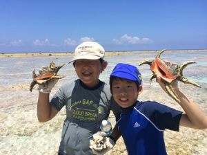 午前中は潮干狩り。と言っても東京のとはちがいます。ご覧の通り潮の引いたリーフの内側まで船で行って、そこから上陸。歩き回って貝を探します。今夜の夕食のおかずになります。午後からは「浜ガメ」(ミナミスナモグリガニ)とりにいきました。これも与論島にいる珍しいカニの仲間です。砂浜の中に住んでいて、足や手で砂をすくい取ると運が良いとその中に見つかります。「浜ガメ」とりの名人、観光課のお兄さんが教えてくれました。これも夕食で素揚げにしてもらって食べました。ちょっと形が…食べましたがおかわりは無理!残りは先生たちのお腹の中へ。そして今晩は満天の星空の下で寝ます。