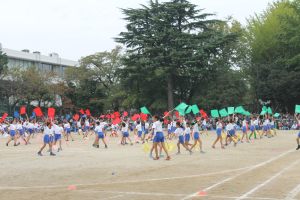 2日前まで雨予報でしたが一転、運動するには最高の天気となりました。運動会は、各学年、各クラスを「赤・青・緑」の3色に分けて得点を争う色別対抗戦です。