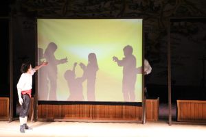 舞台で代表の子どもたちが影絵に挑戦している間、客席でもみんな挑戦。「ここで指をこうして…うーんうまくできないよー!」