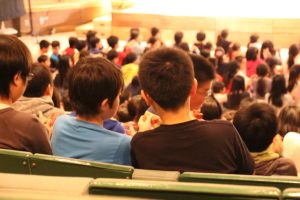 初等学校では、毎年ジャンルを変えながらプロの演劇を鑑賞し、本物に触れる機会を作っています。今年度は、1月14日(木)に観劇会が行われました。劇団かかし座による影絵劇で、「ダンシング・アニマル」という手影絵パフォーマンスと、1~3年生は「長靴を履いた猫」、4~6年生は「宝島」を鑑賞しました。子どもたちが影絵に挑戦するワークショップも行われ、複雑な手の組み方を丁寧に教えてもらいました。