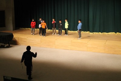 3月の劇の会に向けて舞台の上で先生と確認しながら練習