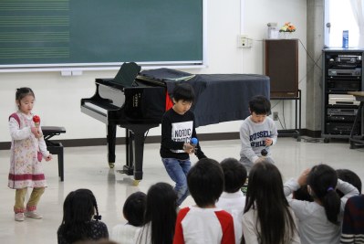 クラス発表会では、クラスメートと保護者の前で歌やけん玉など得意なことを発表