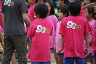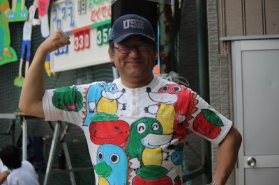 校長のTシャツに描かれているのは初等学校マスコット「どろだんごくん」と「モグとかげ」。校長が描き、子どもたちが色を塗りました。