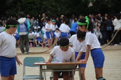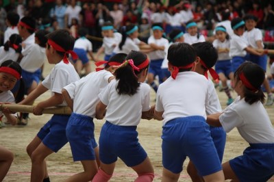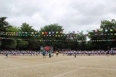 グラウンドをいっぱいに使った5・6年生の綱引き