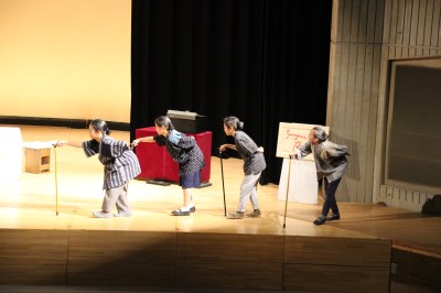 第200回の劇の会で演じた物語の続編。今度は陽気な外国人観光客が「巨大地震が起きて島が沈む」と言い出します。泳ぐ練習、いかだを作る、世界で一番高くなる木を植える、宇宙人の力を借りる、空を飛ぶ練習、祈るなど、さまざまなアイデアを実践する島の人々。そして最後はみんなで地面を押さえつけます。さて「その時」が来ましたが…現れたのはトランプ大統領?!。
