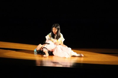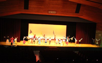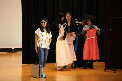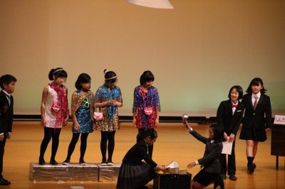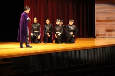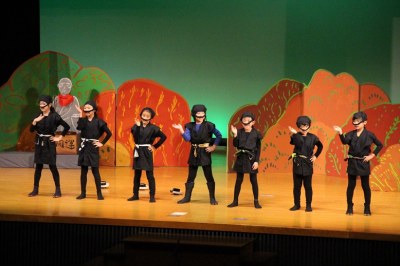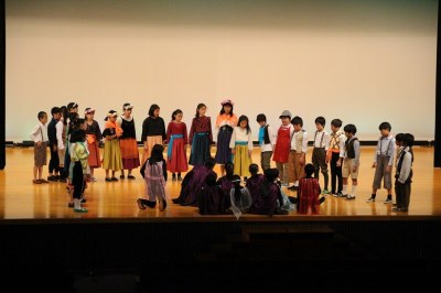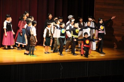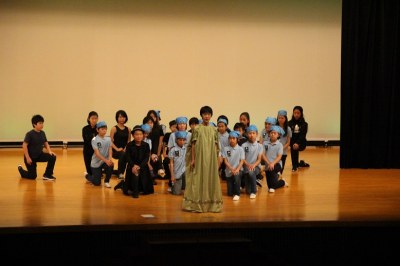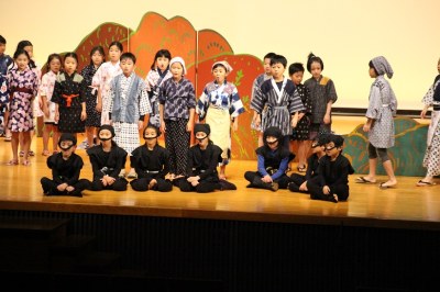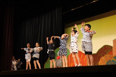 舞台と客席は広くて大きい。でも、舞台の袖は意外に狭い…など、これまでの初等学校の講堂と異なる構造でした。舞台の幕を少し閉めてそこを袖替わりに使う、安全性も考えて大道具はシンプルにする、などさまざまな工夫をして準備してきました。でも、環境は違えど、出演した子どもたちは大きな舞台でのびのびと演技。大きな拍手が記念講堂に響いていました。