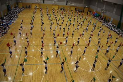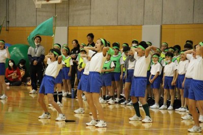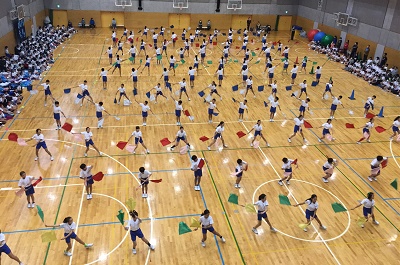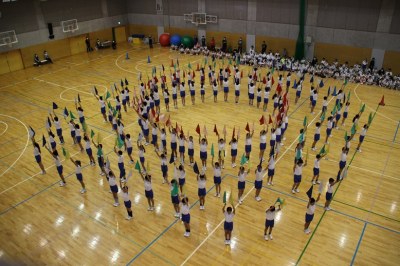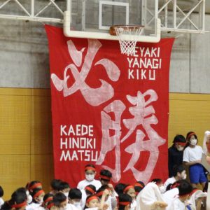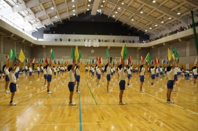 学年の垣根を越えた青・赤・緑の色別対抗戦。チームカラーのハチマキをつけた成城っ子たちは、元気に体育館を駆け回りました。最後の運動会となった6年生の伝統種目・旗体操は、静まり返った体育館に音楽と旗を振る音だけが聞こえる重厚な雰囲気。演技が終わると児童たちはもちろん、観戦した保護者の方からも大きな拍手が起こりました。