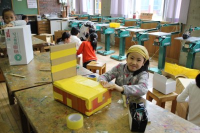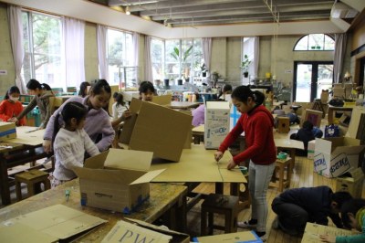 廊下に寝転がっている6年生の子どもたち。よく見ると台車に乗っています。「劇の会で使うんです!」と来週に迫った劇の会へ向けた練習だったようで、何度も廊下を滑っていました。こんな光景が見られるのはクラスデーならでは。他にも、体育館で遊んだり、段ボールでいすを作ったり、ご飯とお味噌汁を作る調理実習があったり、紅白歌合戦と題してグループごとに歌や楽器を披露するクラスもあってみんな楽しそうでした。