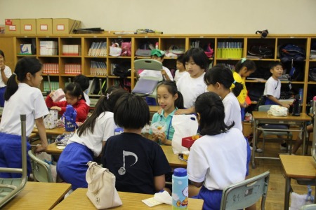 お昼休みには一緒にランチ。高学年は“What sport do you like?”などと英語で話しかける子も。「上海の小学校のお昼は給食なんだって」「スポーツはちょっと苦手だって」など、相手のことを聞いたり、成城のことを話したり、すぐに仲良くなっていました。