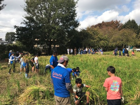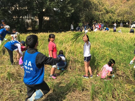 10月10日(水)、世田谷区がJA東京中央の協力を得て開催している稲刈りに、5年生が参加しました。JAの方が中心となって5月に田植えした苗を手入れしてくださり、たくさんのお米ができました。今年は2度も台風が直撃し、多くの稲穂が倒れてしまっていましたが、起こしながら丁寧に刈り取りました。