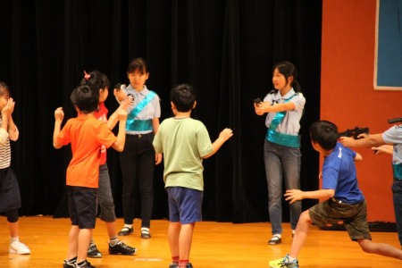 劇中にゲームが出てくる面白い劇。ゲームの結果次第で、劇の展開が変わるので、子どもたちは2パターンの脚本を覚えました。