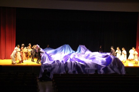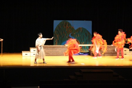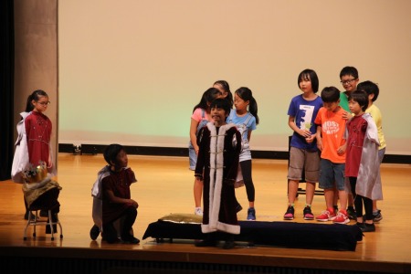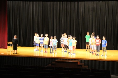 初めて劇の会の舞台に立った3年橘組。カラフルなマントに身を包み、元気いっぱいのびのびと演じることができました。