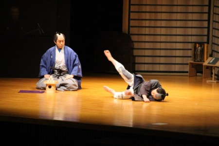当時の江戸の様子がわかったところで拍子木が鳴り、さぁ、はじまり、はじまり。落語らしい言葉遊びやセリフ回し、演者さんの動きなどがとてもおもしろく、いろいろな場面で子どもたちから笑い声が上がりました。上演前の解説のおかげで物語の内容もつかみやすかったようで、江戸の人情味あふれるお話の世界に浸ることができました。終わって教室に戻るまでの間には、「キムチのところのやりとりがおもしろかった!」などと感想を話したり、「あさり~、しじみっ!」と売り声の真似をしたり、とても印象に残る劇だったようです。