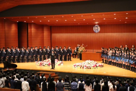記念講堂の広いステージを堂々と行進する卒業生たち