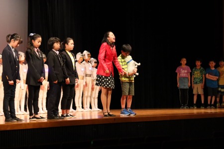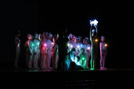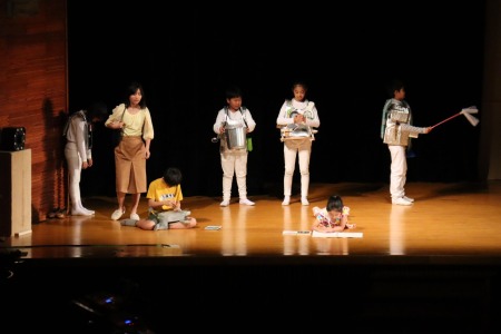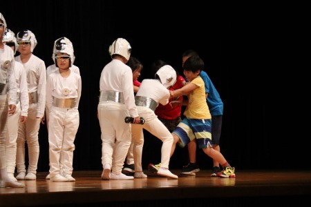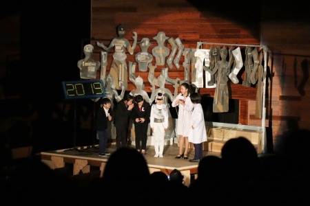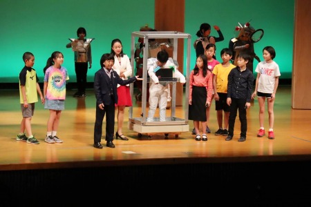 題名は「ココロノカギ」。脚本は劇研究部の教員全員による集団創作です。「AIの時代と言われ、デジタル化・機械化が進む現代社会において、人間にとって本当に大切なものは何か」をテーマとし、未来を生きる子どもたちへのメッセージを込めました。出演したのは4~6年生の児童有志44人。昨年12月から練習を始め、約4か月かけて準備してきました。当日は澤柳記念講堂の広い舞台で熱演し、観客の皆さんを劇の世界に引き込んでいました。