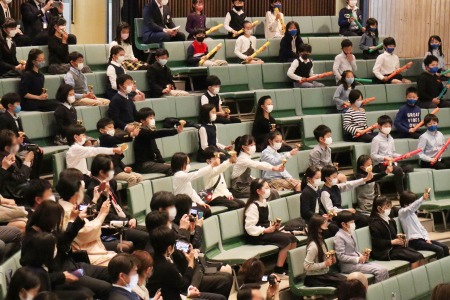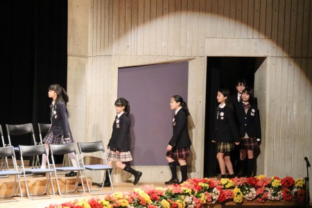 全校児童を3つのグループに縦割りにした青、赤、緑グループごとに3回に分かれて時間をずらし、保護者の方、先生方、そして1~5年生の在校生が見守る中で行われました。会場からの大きな拍手に迎えられ、晴れやかな表情の卒業生が入場しました。渡辺校長から「みなさんの根っこはこの初等学校にあります。明るい未来に向かって、大輪の花を咲かせてください。応援しています!」と激励の言葉が贈られました。背すじをすっと伸ばしてしっかり前を向いて舞台を歩く卒業生の姿は自信に満ち溢れているようで、初等学校の6年間で立派に成長した姿を見せてくれました。