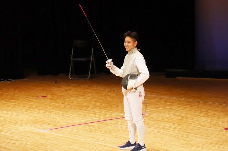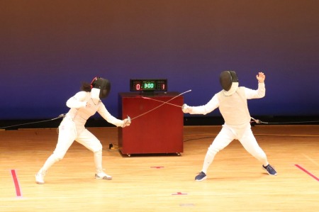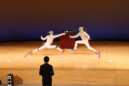 フェンシングの練習風景も披露。先生は頑丈な黒いベストを着て選手の練習相手をします