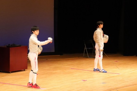第二部は講堂に場所を移して「オリンピック競技の観戦~フェンシングの実際」と題してフェンシングの演武を観戦しました。ここでの解説はフェンシングの元オリンピック選手の桐谷先生(桐ちゃん)です。小学5年と中学1年の成城っ子による演武でフェンシングの競技「フルーレ」「エペ」の違いや練習の仕方などを知りました。その後、日本代表選手によるオリンピック決勝戦を再現した「サーブル」の演武を観戦。フランス語・英語・日本語での選手紹介、審判もついて本番さながらの演武を桐谷先生の解説付きで観戦するとても贅沢な機会となりました。迫力ある対戦を間近に観戦することができて、これから開催されるオリンピック・パラリンピック大会への期待も高まったことと思います。