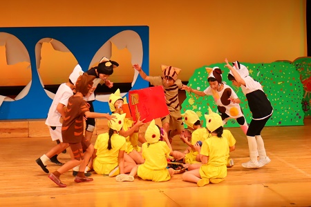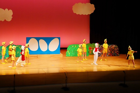 おくれて生まれてきたひよこたちは、次々出会う動物を自分たちのお父さん、お母さんと思いこみ真似してついていこうとします。最後に出会ったのはひよこたちを獲物に狙うのらねこたち。親と信じてついてくるひよこたちと行動をともにするうちに愛情が芽生えてくるのらねこたち。彼らの前に本物のお父さん、お母さんのニワトリが現れてのらねこたちを退治しようとします。のらねこを守ろうと立ちはだかるひよこたち。本物の親子ではないのらねことひよこの間にお互いを思いやる気持ちが芽生えて…。劇の会のオープニングを飾った柚組。緊張もあったと思いますが、楽しそうに立派に劇を演じ切りました。