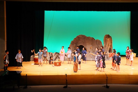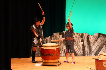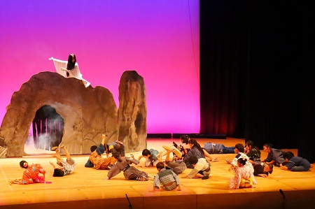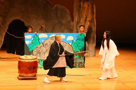 昔むかし、村に住む竜の悪行に村人たちは苦しめられていました。日々竜に悩まされていた村を一人のお坊さんが岩山に竜を閉じ込めて救ってくれました。竜を閉じ込めておくための2つの大切な約束、それは「岩山にしめ縄をすること」と「太鼓を叩き続けること」。この「竜神伝説」を信じ、太鼓を叩き続ける権蔵ですが、長い年月が経ち、この太鼓の音をうるさく思い始めた村人たちとの間に諍いが起り、いつしか大切な約束も破られてしまいます。復活した竜に村人たちはどう立ち向かうのか…。登場人物の感情が迫真の演技とともに表現され、観客をストーリーに引き込む素晴らしい劇でした。