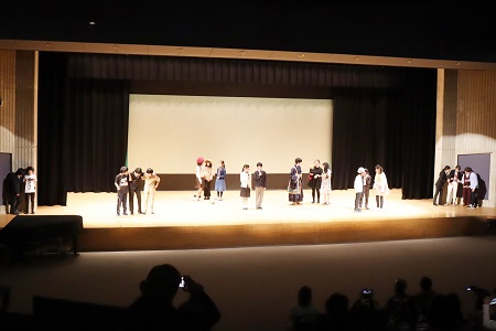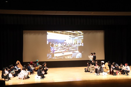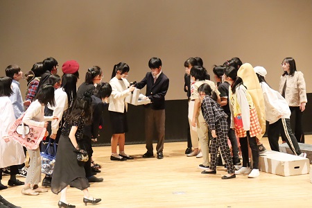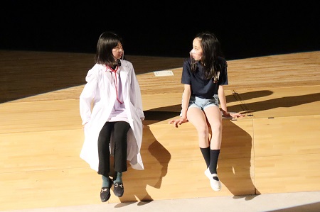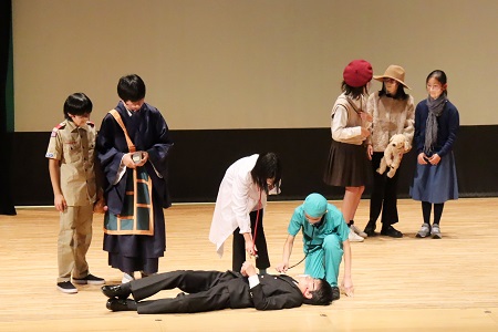 コロナ禍でこれまでの日常が失われ、この先の未来がどうなっていくのか心配する現在の桧組の子どもたち。一方、18年後の桧組の卒業生は、初等学校の時に描いた夢をしっかり叶えていました。30歳になった卒業生たちが集まりタイムカプセルを開いてみると…誰も撮った覚えのない写真がみつかり、いつどこで撮ったのか謎を解くために初等学校へ向かいます。初等学校を舞台に、現在の桧組の子どもたちと18年後の大人になった桧組のみんなが遭遇し、不思議な交流をするお話です。将来の同級生に会って伝えられたメッセージは「今を思いっきり楽しむこと!」。そうすれば毎日がたのしい!になる、と大切な言葉をもらいました。約30分にわたる創作劇、「フィクション」でありながら今の桧組だからこそできるリアルなセリフが印象的でした。言葉だけではなく、セリフのない場面でも一人一人が演じる役になりきり、最初から最後まで観客を惹きつけました。